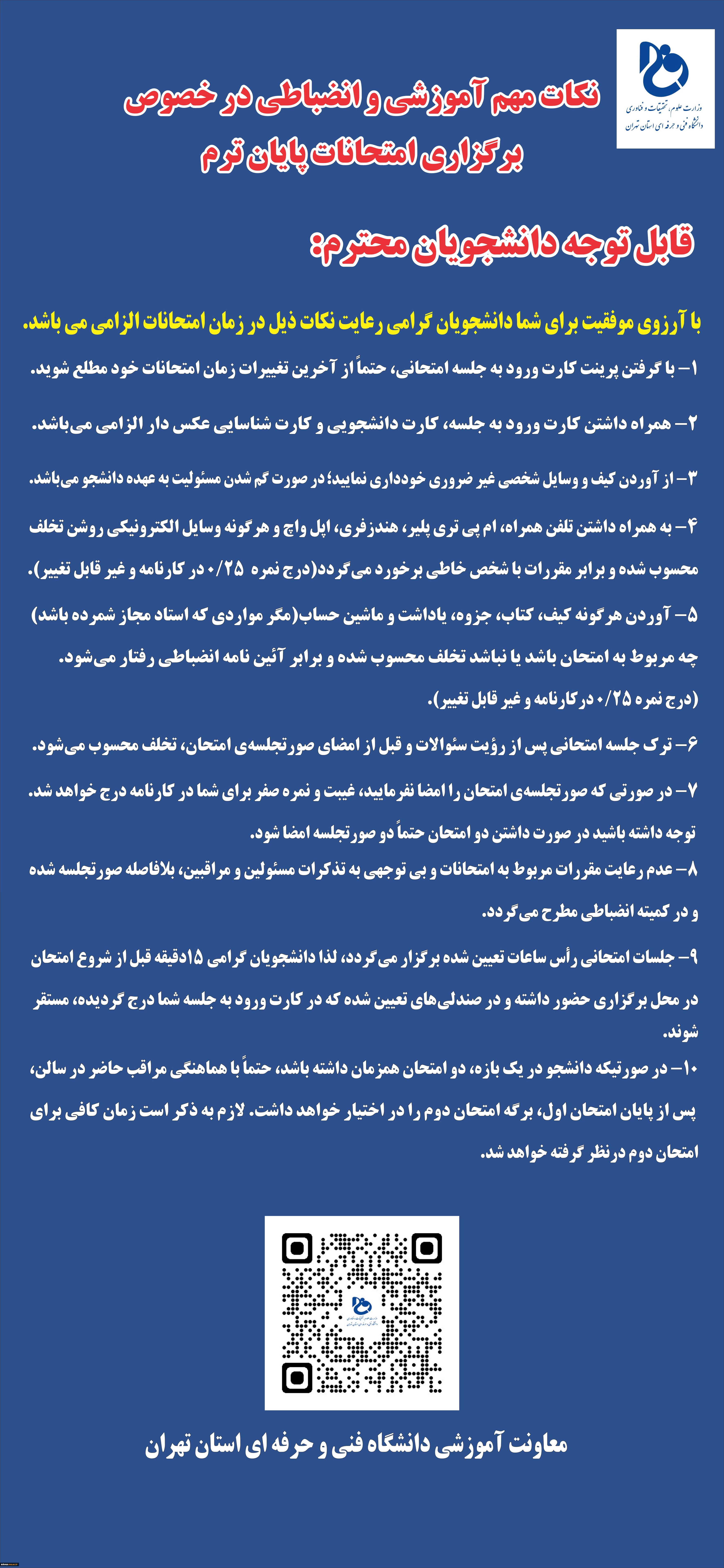 امتیاز دهید : نکات مهم آموزشی و انضباطی در خصوص برگزاری امتحانات پایان ترم 3 شنبه 20 خرداد 1402 ساعت 14:29