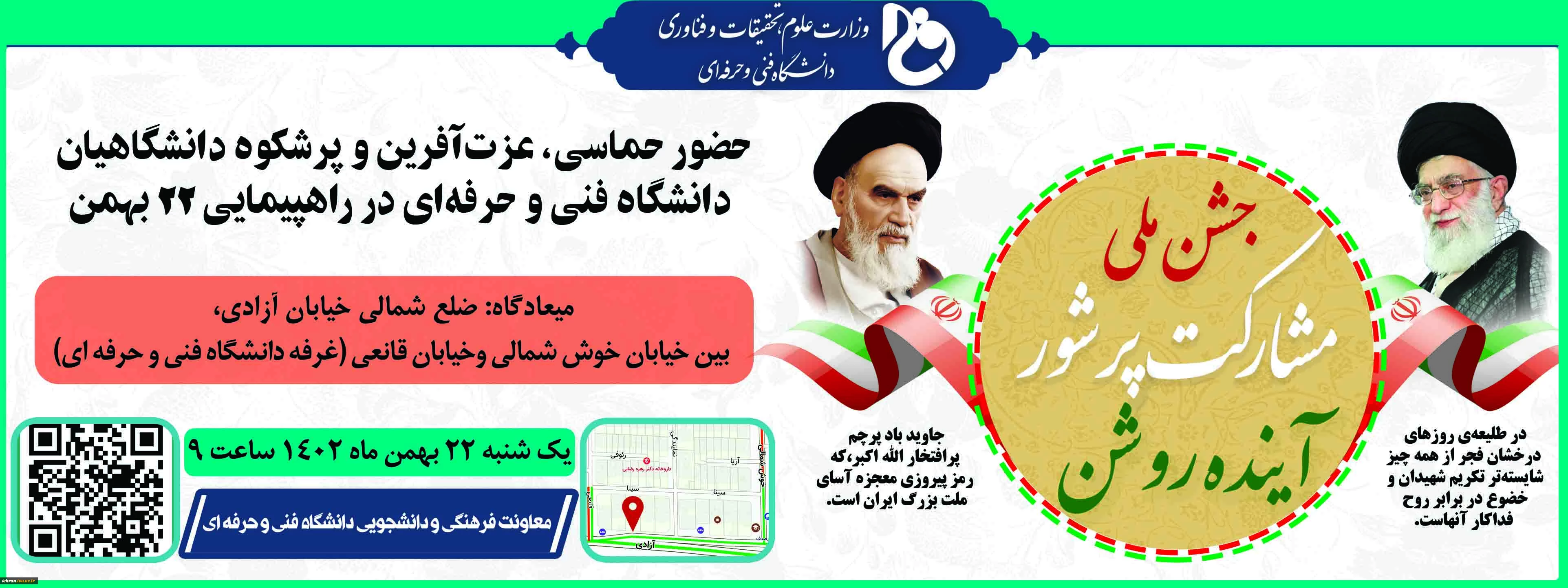 امتیاز دهید : حضور حماسی، عزت آفرین و پرشکوه دانشگاهیان دانشگاه فنی و حرفه ای در راهپیمایی 22 بهمن 2 چهارشنبه 18 بهمن 1402 ساعت 13:03