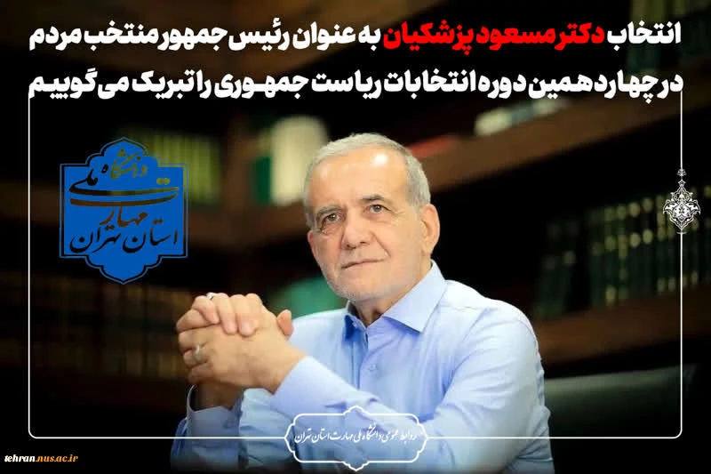 انتخاب جناب آقای دکتر مسعود پزشکیان به عنوان رئیس‌جمهور منتخب ملت شریف ایران در چهاردهمین دوره انتخابات ریاست جمهوری را تبریک عرض می‌ نماییم. 2