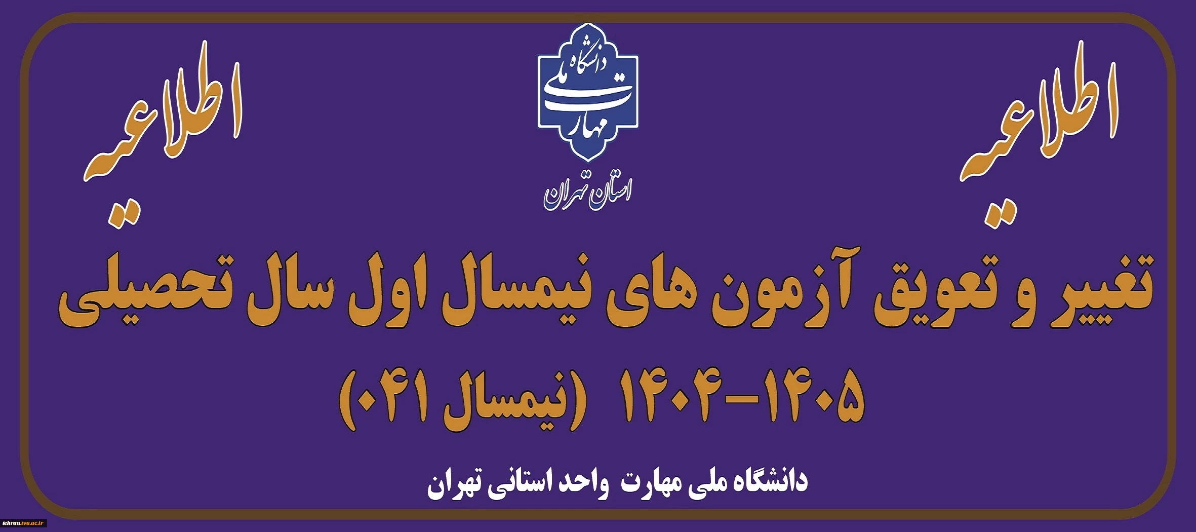امتیاز دهید : اطلاعیه تغییر و تعویق آزمون های نیمسال اول سال تحصیلی 1405-1404(041) 2 شنبه 20 دی 1404 ساعت 13:12